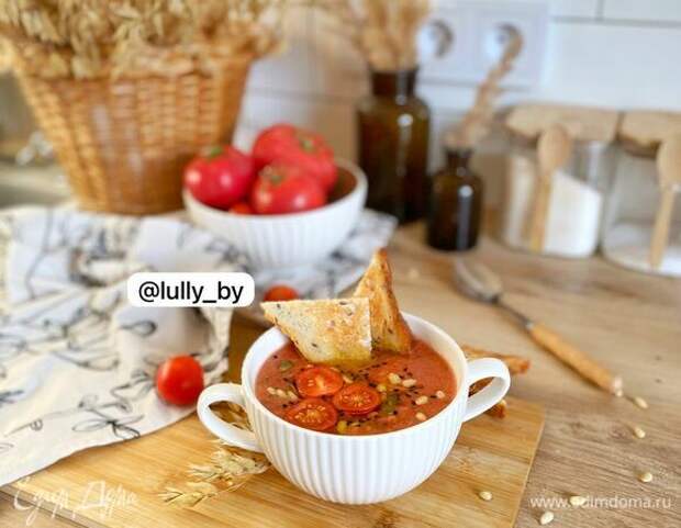 Наш гаспачо готов! Идеально подавать его с гренками, оливками, маслинами, орешками и оливковым маслом. Можно также разбавить суп водой.